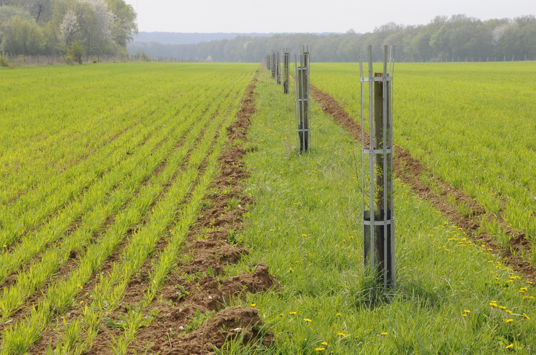 En février 2011, 650 arbres de 15 essences différentes ont été plantés en alignement au sein de trois parcelles en prairies incluses dans la rotation prairie/cultures (superficie totale du dispositif : 23 ha 08).