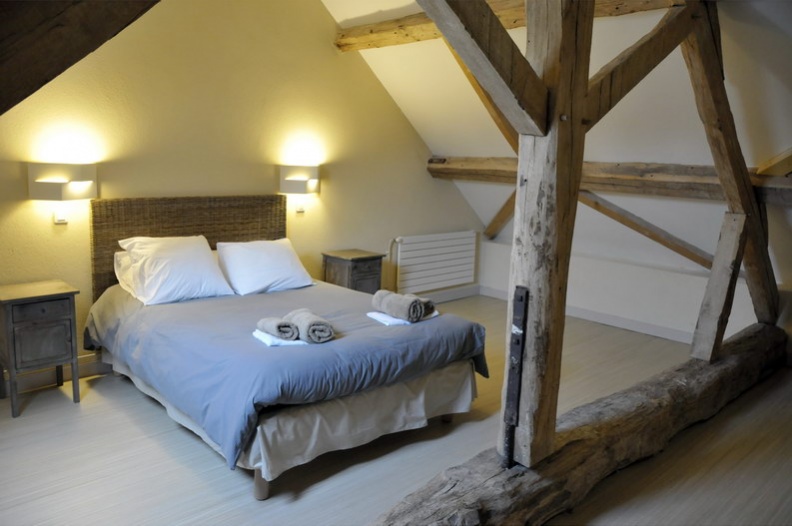 En mezzanine, vous pourrez vous adonner à la rêverie dans le coin nuit particulièrement cosy, avec ses poutres apparentes et ses teintes naturels : 1 lit 140x200 cm, et 1 lit d’appoint 90x190 cm préparé sur demande.