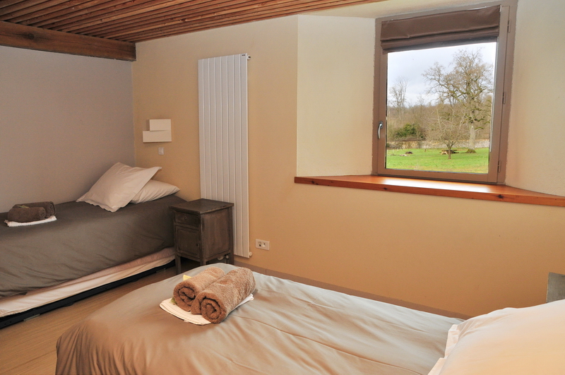 L’escalier en bois dessert au 1er étage deux chambres et des WC indépendants. Côté cour, la 1ère chambre comporte 1 lit 140x200 cm. Côté pré au chêne, la 2e chambre comporte 2 lits 90x200 cm et 1 lit d’appoint (90x190 cm) préparé sur demande .